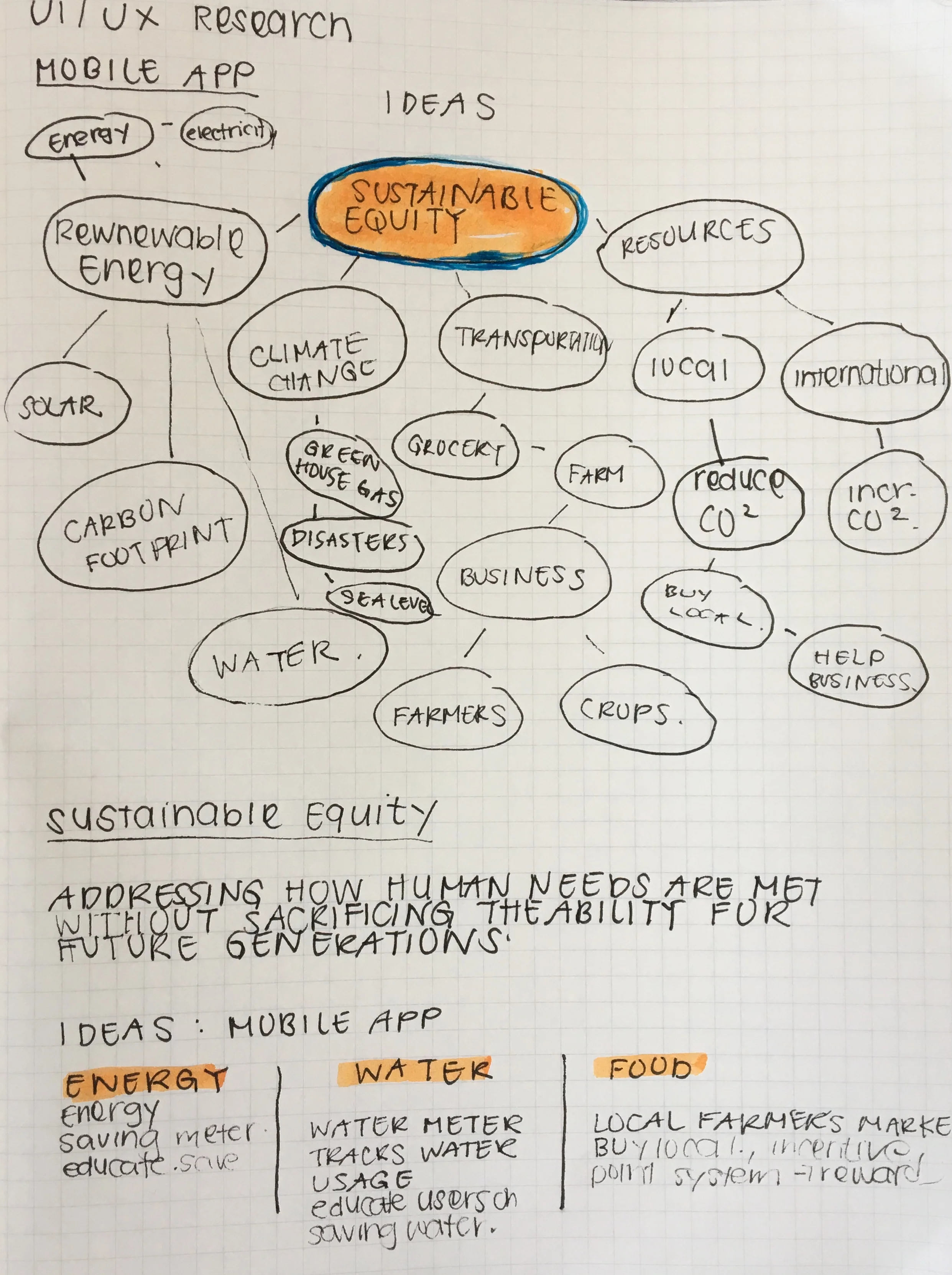 In this phase, I brainstormed ideas for my mobile app and I focused on the topic of sustainable equity. During the ideation phase I thought about water and energy usage, but I found food and produce to be an interesting topic. Especially on how might local farmers connect with locals to promote sustainability and foster caring communities.